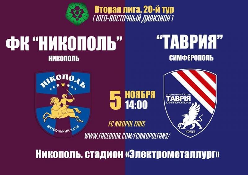 В воскресенье, 5 ноября, в рамках 20-го тура, второй лиги, Никополь принимает симферопольскую "Таврию".
