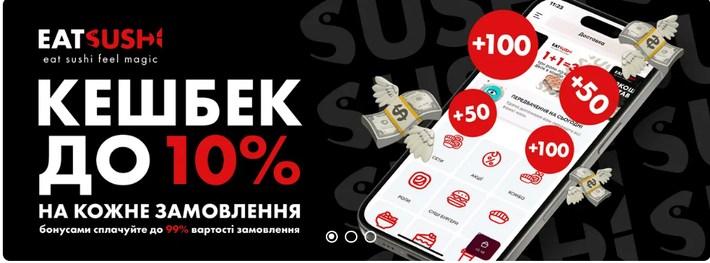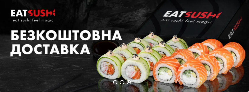 - Акції та знижки. EatSushi регулярно радує клієнтів спеціальними пропозиціями: знижки на сети, подарунки до замовлення, знижки у дні народження.