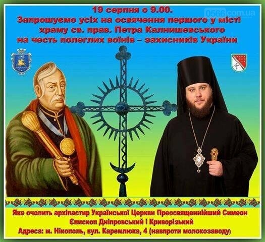 Шановні нікопольці, 19 серпня о 9.00 відбудеться освячення храму св. прав. Петра Калнишевського на честь полеглих воїнів - захисників України.